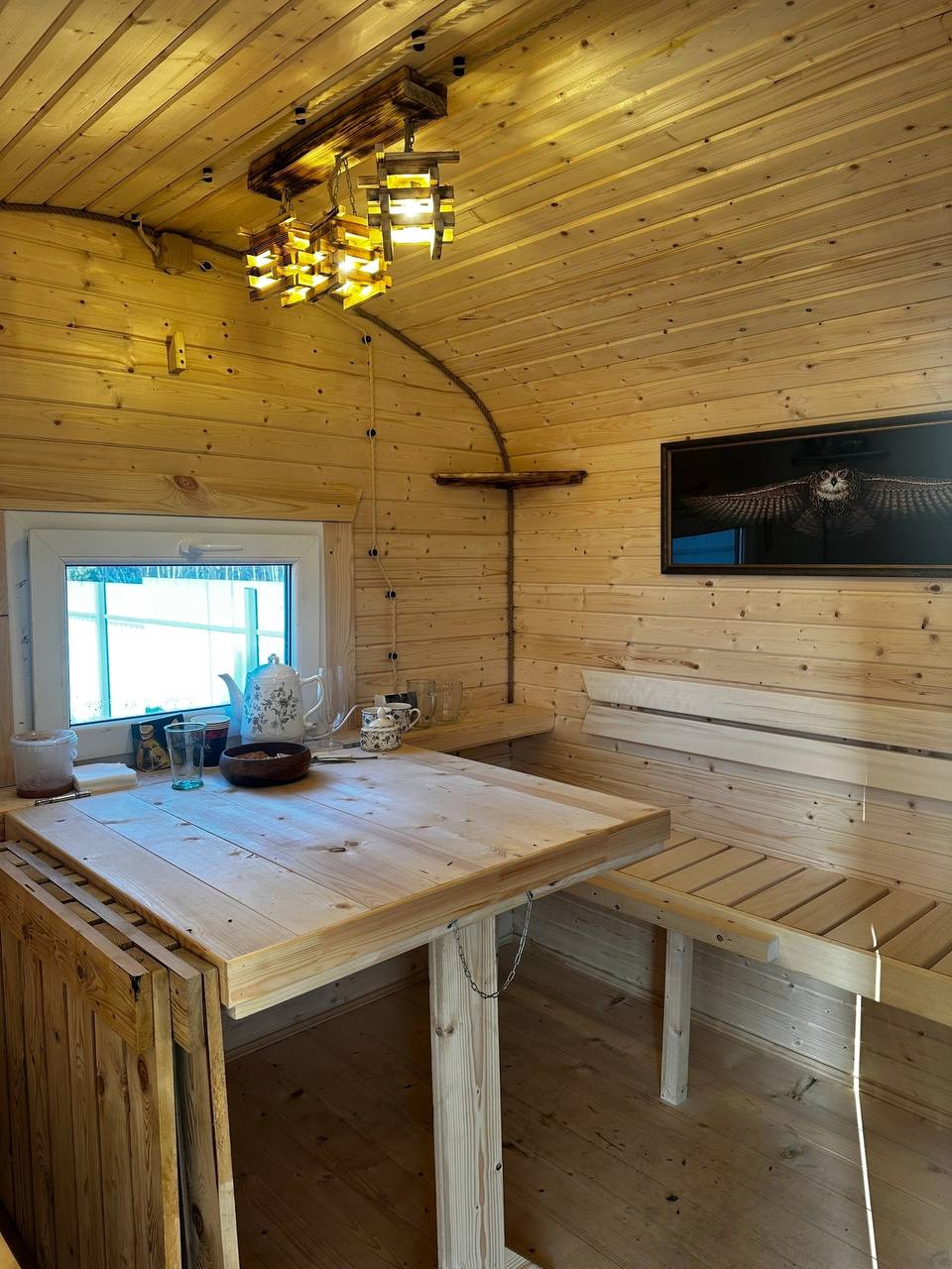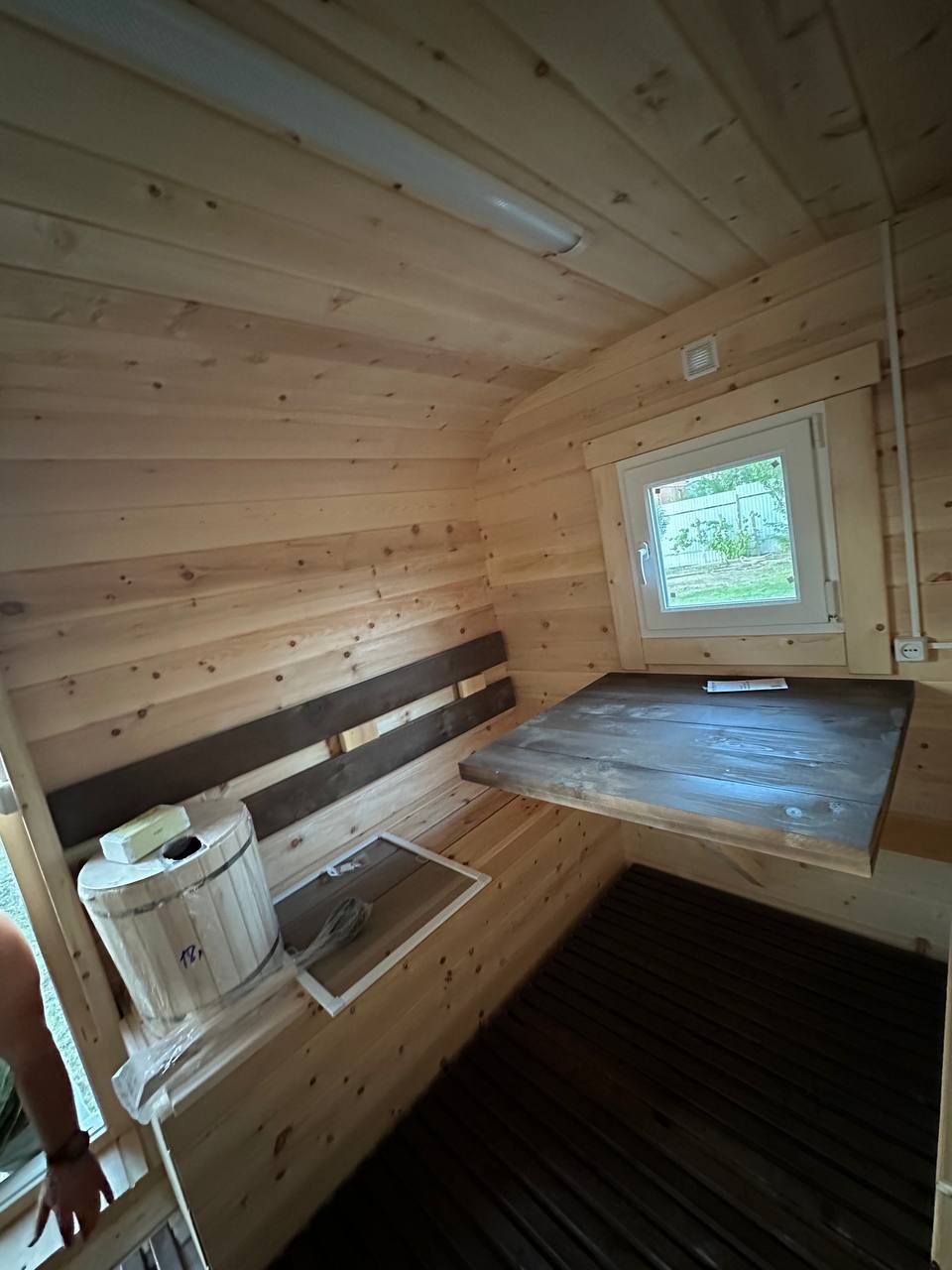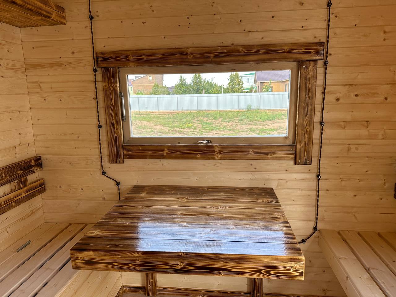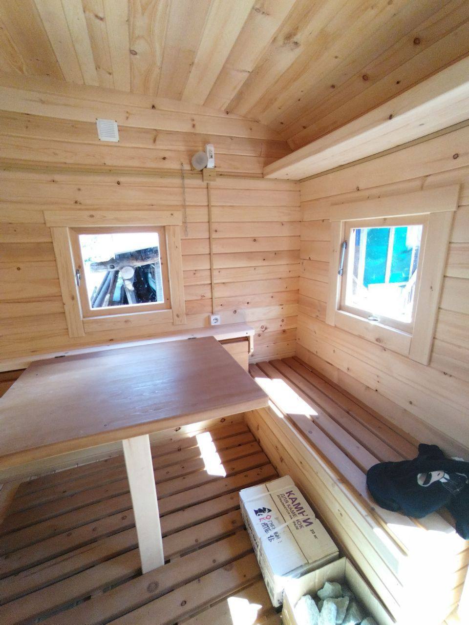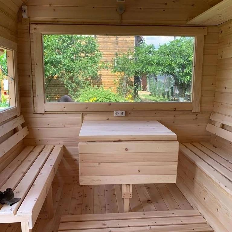- Окна: Деревянный оконный блок из массива сосны с одинарным остеклением 300х300мм, со всей необходимой фурнитурой петли, ручка, наличники из доски 20х90 мм