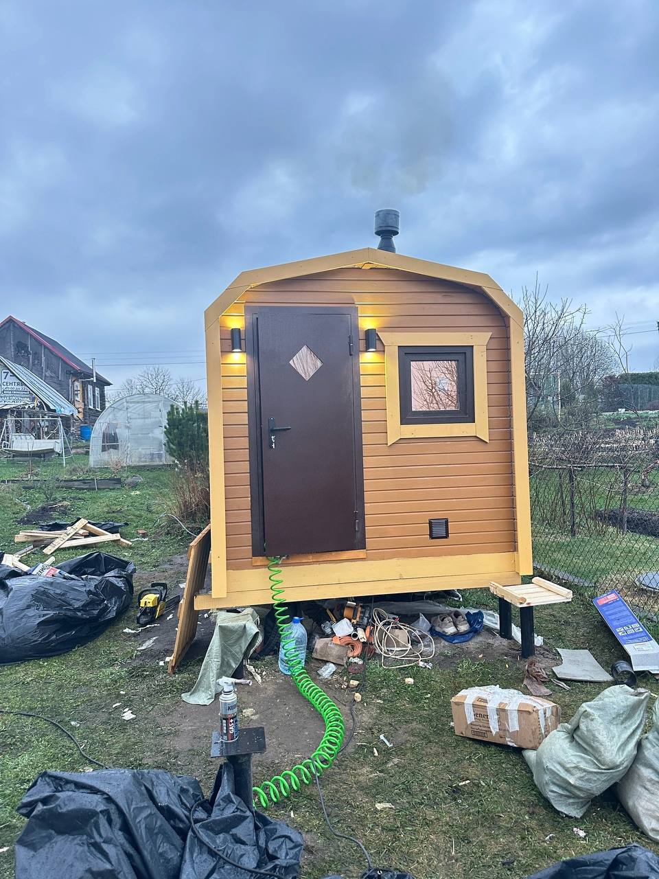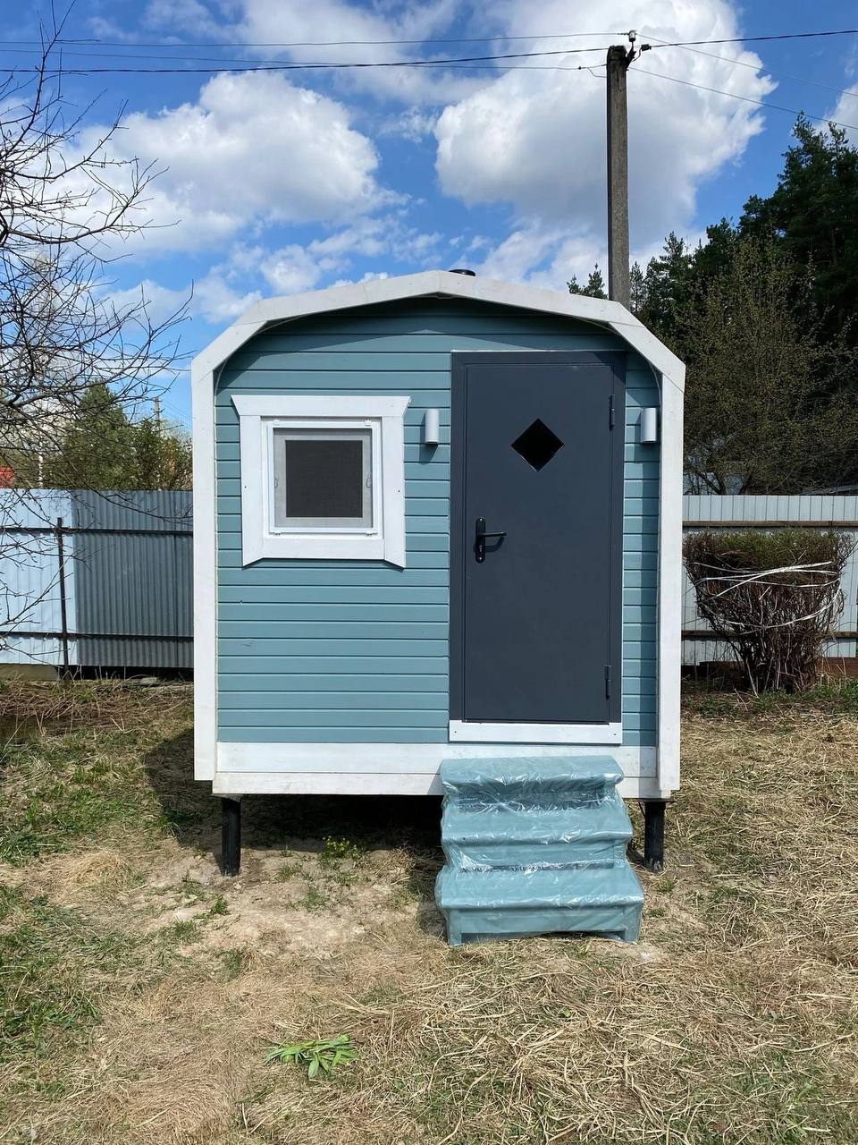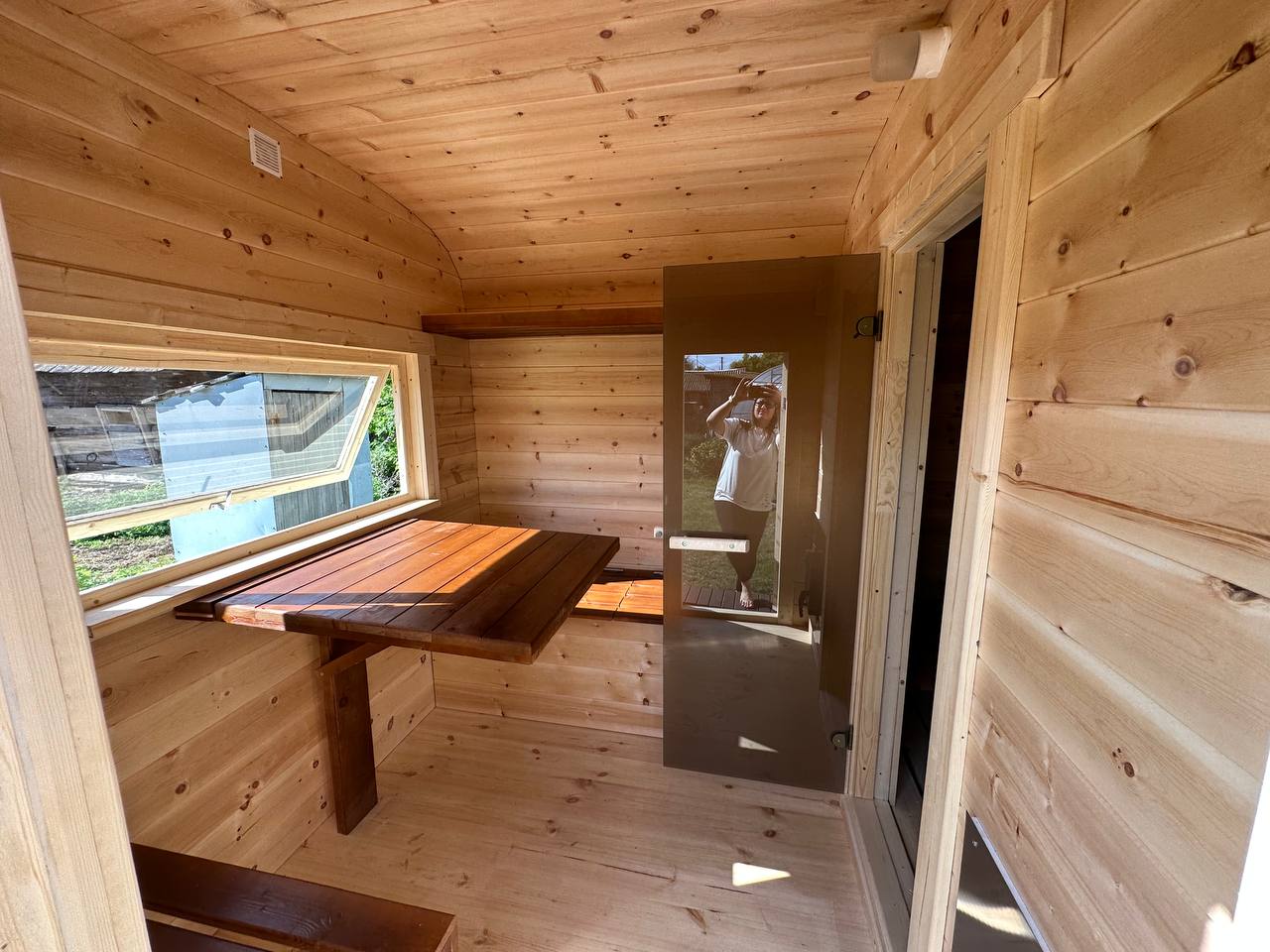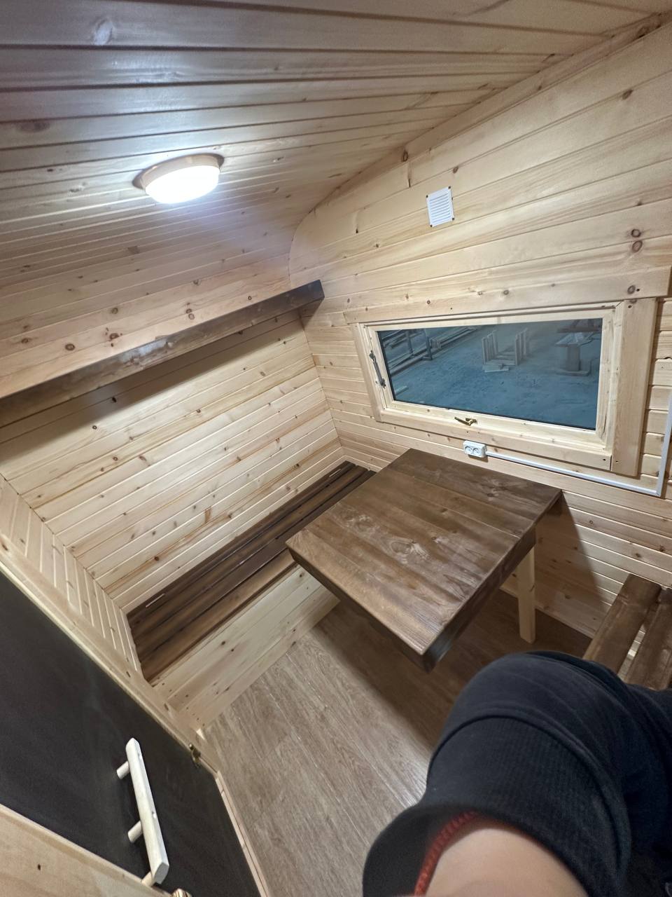 - Окна: Деревянный оконный блок из массива сосны с одинарным остеклением 300х300мм, со всей необходимой фурнитурой петли, ручка, наличники из доски 20х90 мм